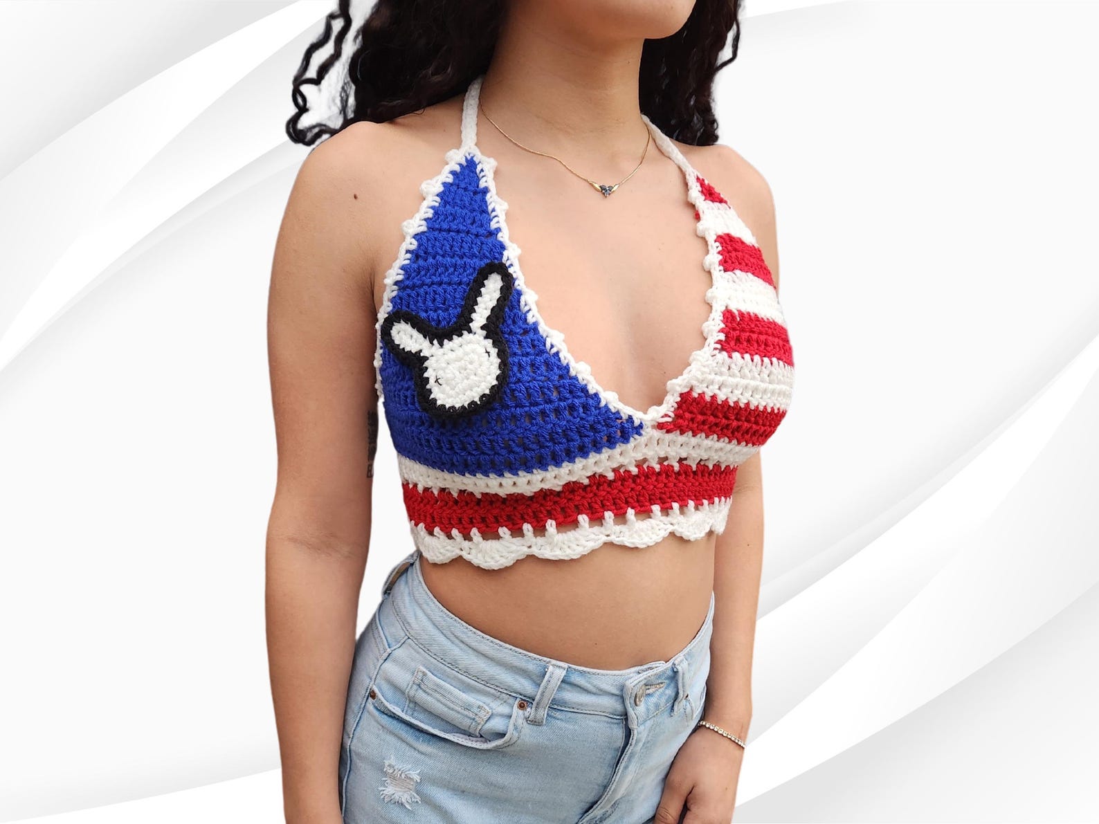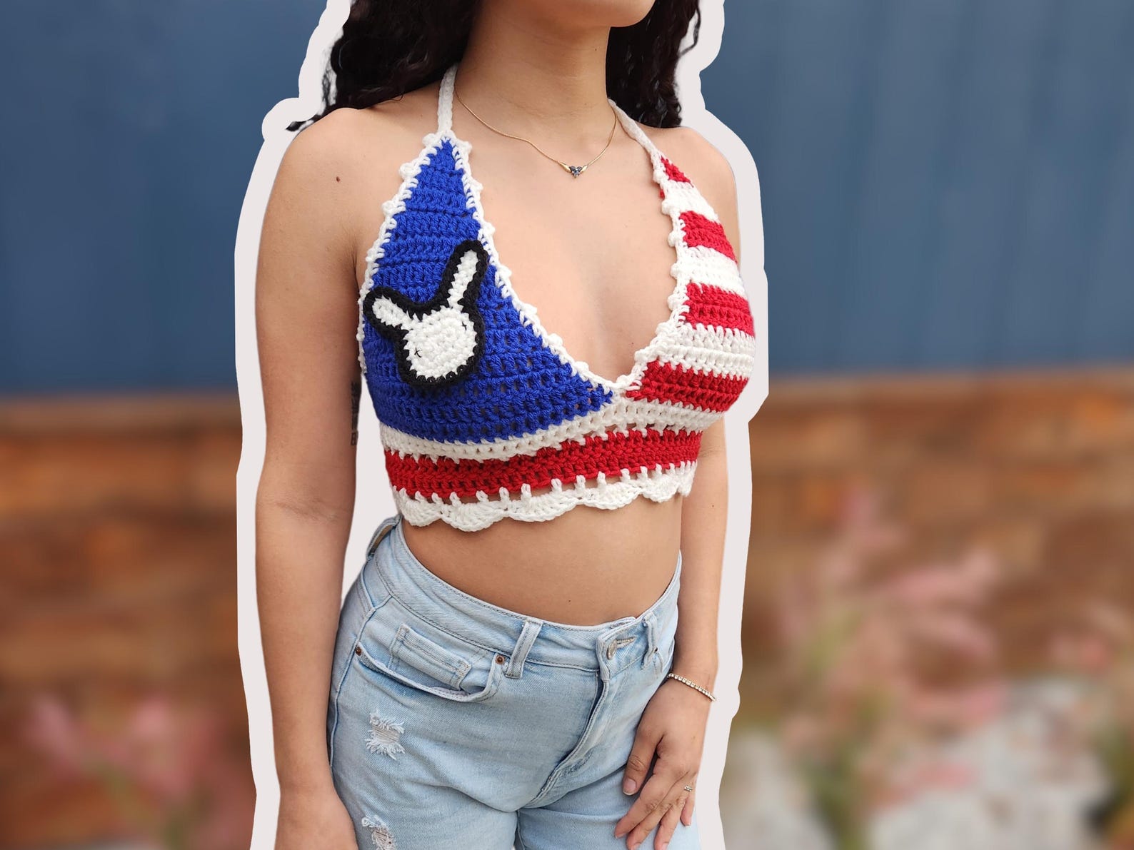 Show off your Boricua pride with this vibrant, handmade crochet Bralette/ crop top! Featuring the colors of the Puerto Rico flag. One side showcases the blue with the Bad Bunny logo (instead of the star), while the other side displays red and white stripes. Securely ties at the neck and back for a comfortable, adjustable fit.